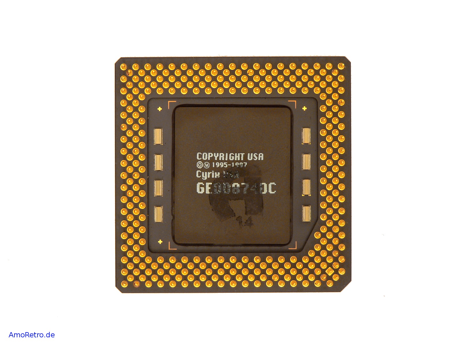 Bemerkungen: Beim 6x86MX handelt es sich um eine im Herstellungsprozess von 0,35µm gefertigte 6×86 CPU, die mit der von Intel entwickelten MMX-Technologie ausgestattet ist. Darüber hinaus wurde im Zuge weiterer Architekturverbesserungen der L1 Cache von 16KB auf nunmehr satte 64KB vergrößert. Die Integerleistung ist wie schon beim Vorgängermodell sehr gut, die Fließkommaleistung wurde zwar auch verbessert, bleibt jedoch noch immer deutlich unter Intel-Niveau, daher ist die CPU für die damals aufkommenden 3D-Spiele, die nach stärkerer FPU-Leistung verlangten, nicht sonderlich gut geeignet. Für nicht-fließkommaintensive Spiele war die CPU jedoch eine sehr preiswerte Alternative zum Intel. Für Sammler: von den drei 6x86er Labels Cyrix, IBM und ST ist die ST-Version von STMicroelectronics (von 1987 bis 1998 noch SGS-Thomson) am wenigsten verbreitet, jedoch noch immer (Stand 2012) recht gut verfügbar. Da Cyrix keine eigenen Fertigungsstätten besaß, ließ man bei IBM und STMiroelectronics fertigen, wobei die Produkte von IBM sowohl mit IBM- als auch mit Cyrixlabel auf den Markt kamen.