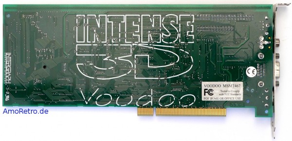 Besonders schön ist die Rückseite der Intergraph Karte, die ein großes Logo mit der Aufschrift „Intense 3D Voodoo“ ziert. Damit reiht sich die Karte nahtlos in die Tradition von Hercules, Orchid und auch Number Nine ein, die ebenfalls viele ihrer Karten rückseitig verzierten.