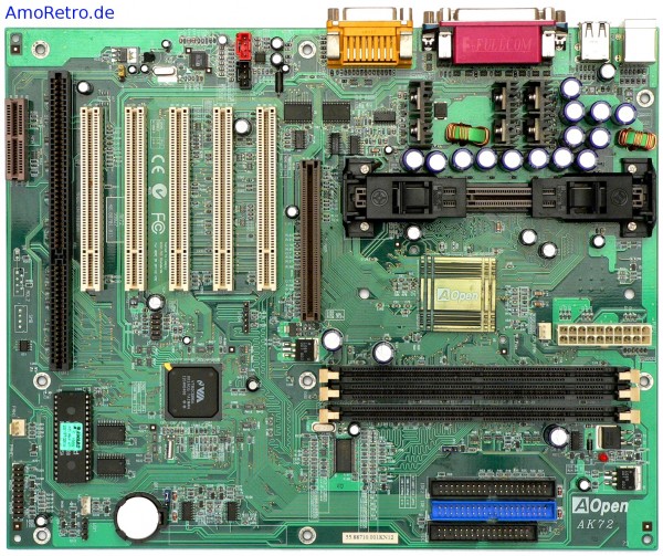 Das AK72 ist ein grundsolides Board für die erste Generation der Athlon Prozessoren im Slot-A Format. Es setzt auf die der AMD Irongate überlegenere VIA-Kombilösung bestehend aus der Northbridge KX133 und der Southbridge 686A. Wie üblich sind 5 PCI-Slots und drei Dimm-Sockel (mit PC133 Support) verbaut, leider wurde anstelle eines zweiten ISA-Slots ein mehr oder weniger sinnloser AMR-Slot verbaut.  Neben der fast schon üblichen onboard Soundlösung bietet das AOpen-Board als Besonderheit die Unterstützung von bis zu 1,5GB SDRAM, die meisten anderen KX133 Boards brachten es auch maximal 768MB Support. Durch die 6 Spannungswandler konnten die stromhungrigen CPU’s ausreichend versorgt werden, im Betrieb ist das Board absolut unauffällig und stabil, wobei es sich im Gegensatz zum Epox K7XA auch wesentlich unkritischer im Bezug auf die gewählten Speichermodule verhält.