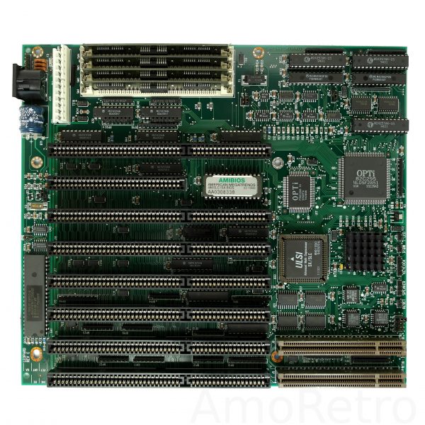 Beim ersten Betrachten der sehr hochwertig verarbeiteten Platine fragt sich vielleicht der ein oder andere, wo denn der Prozessor abgeblieben ist. Die Antwort ist einfach und macht vielleicht stutzig, denn der Prozessor befindet sich unter dem winzig kleinen Kühlkörper, direkt unter dem OPTi 295 Singlechip. Es handelt dabei um den IBM 486SLC2 mit 66MHz. Dieser ist im Grunde ein Intel 386SX mit 486er Befehlssatzerweiterung, satten 16KB Cache und interner Taktverdoppelung. Der 386SX ist wiederum ein 386er, der zwar intern in 32-Bit rechnet, aber wie der 286er an einem 16-Bit schmalen Datenbus hängt. Das erlaubt ein vergleichsweise leiterbahnenarmes und dadurch kosteneffektives Design des Chipsatzes und der Hauptplatine. Links neben dem Prozessor befindet sich ein ULSI SX /SLC Coprozessor für Fließkommaberechnungen. Der Coprozessor läuft mit 33MHz Bustakt.